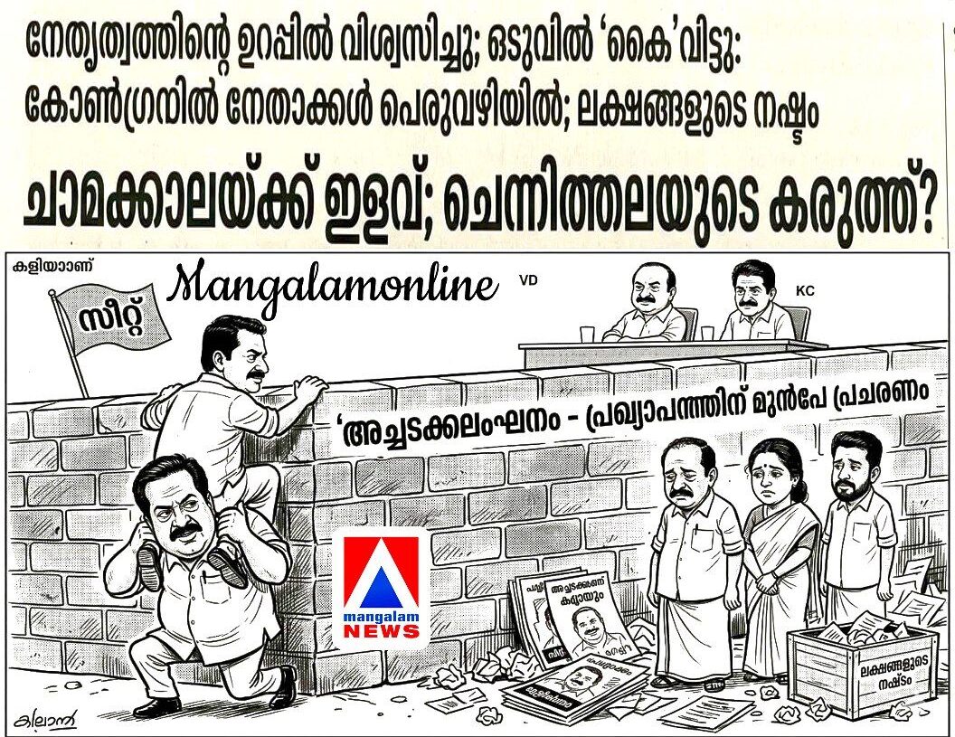 KERALA നേതൃത്വത്തിന്റെ ഉറപ്പിൽ വിശ്വസിച്ചു; ഒടുവിൽ ‘കൈ’വിട്ടു: കോൺഗ്രസിൽ നേതാക്കൾ പെരുവഴിയിൽ; ലക്ഷങ്ങളുടെ നഷ്ടം ചാമക്കാലയ്ക്ക് ഇളവ്; ചെന്നിത്തലയുടെ കരുത്ത്?by mangalam March 23, 2026
