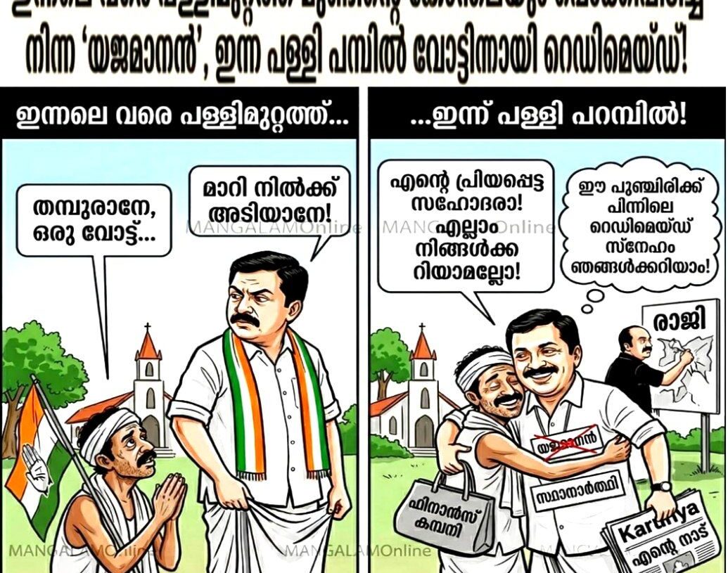 POLITICS “ഇന്നലെ വരെ പള്ളിമുറ്റത്ത് മുണ്ടിന്റെ കോന്തലയും പൊക്കിപ്പിടിച്ച് നിന്ന ‘യജമാനൻ’; ഇന്ന് പള്ളി പറമ്പിൽ വോട്ടിനായി റെഡിമെയ്ഡ് പുഞ്ചിരിയുമായി കെട്ടിപ്പിടിക്കാൻ വരുന്നു!”by mangalam March 23, 2026