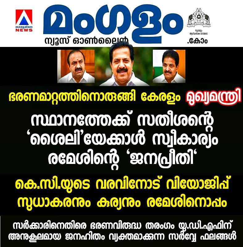 KERALA ഭരണമാറ്റത്തിനൊരുങ്ങി കേരളം; മുഖ്യമന്ത്രി സ്ഥാനത്തേക്ക് ചെന്നിത്തലയ്ക്ക് ജനപ്രീതി; സതീശന്റെ ‘ശൈലി’യേക്കാൾ സ്വീകാര്യം രമേശിന്റെ ‘അനുഭവം’by mangalam March 25, 2026