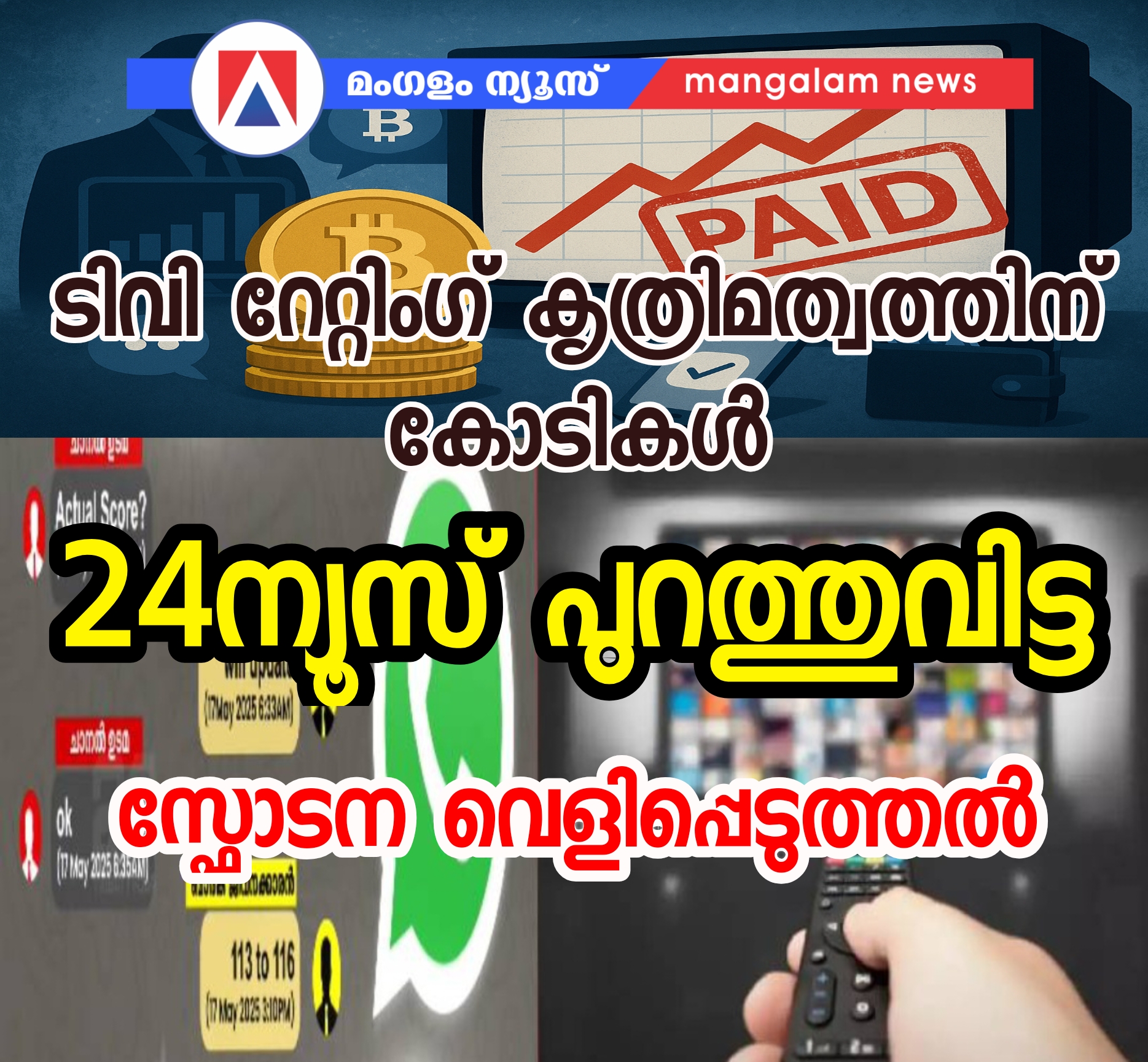 • ഇന്ത്യൻ ടെലിവിഷൻ ചാനലുകളുടെ റേറ്റിംഗ് നിർണയിക്കുന്ന ബാർക്ക് (ബ്രോഡ്കാസ്റ്റ് ഓഡിയൻസ് റിസർച്ച് കൗൺസിൽ) ഏജൻസിയിലെ ഉദ്യോഗസ്ഥരും കേരളത്തിലെ ഒരു ചാനൽ ഉടമയും തമ്മിലുള്ള സംശയാസ്പദമായ സാമ്പത്തിക ഇടപാടുകളുടെ തെളിവുകൾ പുറത്തുവിട്ട് ട്വന്റിഫോർ ന്യൂസ്. ക്രിപ്റ്റോകറൻസി വഴി കോടികൾ കൈമാറ്റം ചെയ്യപ്പെട്ടതായും റേറ്റിംഗ് നമ്പറുകൾ മുൻകൂട്ടി അറിയിച്ചതിന്റെ വാട്സാപ്പ് സംഭാഷണങ്ങളുണ്ടെന്നും റിപ്പോർട്ടിൽ അവകാശപ്പെടുന്നു.