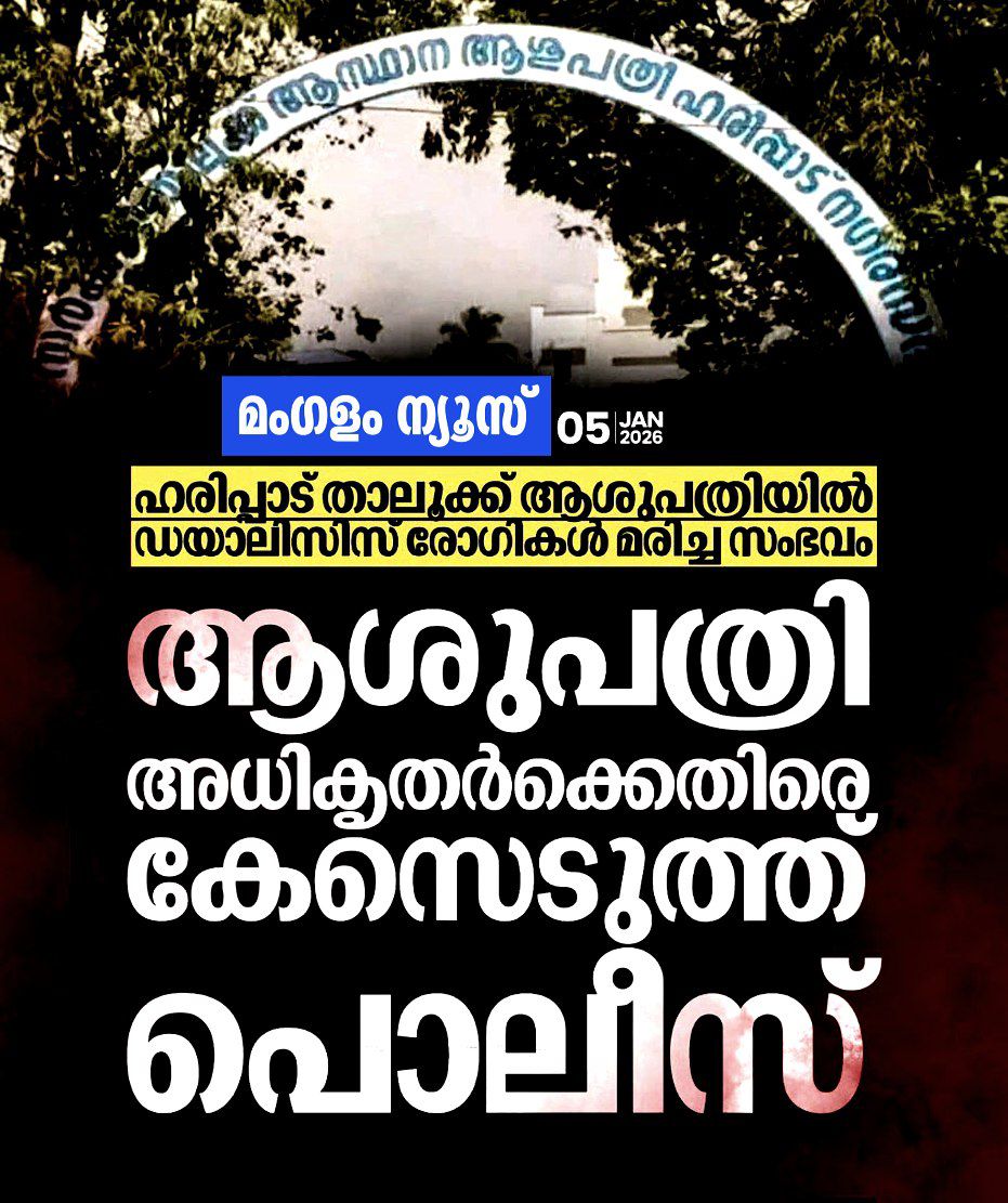 ഹരിപ്പാട് താലൂക്ക് ആശുപത്രിയിൽ ഡയാലിസിസ് രോഗി മരിച്ച സംഭവത്തിൽ ആശുപത്രി അധികൃതർക്കെതിരെ പൊലീസ് കേസെടുത്തു. ഹരിപ്പാട് സ്വദേശി രാമചന്ദ്രന്റെ (60) മരണത്തിലാണ് പൊലീസ് എഫ്ഐആർ രജിസ്റ്റർ ചെയ്തത്. താലൂക്ക് ആശുപത്രി സൂപ്രണ്ടും ഡയാലിസിസ് യൂണിറ്റ് ജീവനക്കാരും ഉൾപ്പെടെയുള്ളവർക്കെതിരെയാണ് കേസ് രജിസ്റ്റർ ചെയ്തിരിക്കുന്നത്.