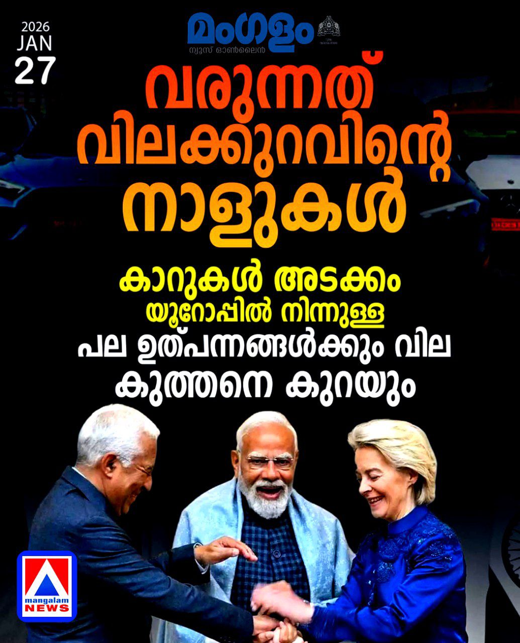 ന്യൂഡൽഹി: ഇന്ത്യയും യൂറോപ്യൻ യൂണിയനും തമ്മിൽ ഒപ്പുവെച്ച ചരിത്രപരമായ സ്വതന്ത്ര വ്യാപാര കരാർ (FTA) രാജ്യത്തെ സാധാരണക്കാർക്കും വിപണിക്കും വലിയ ആശ്വാസമാകുന്നു. കരാർ പ്രാബല്യത്തിൽ വരുന്നതോടെ യൂറോപ്പിൽ നിന്നുള്ള കാറുകൾ, വൈൻ, സംസ്കരിച്ച ഭക്ഷ്യവസ്തുക്കൾ എന്നിവയ്ക്ക് ഇന്ത്യയിൽ വൻതോതിൽ വില കുറയാൻ വഴിയൊരുങ്ങും. ഡൽഹിയിൽ നടന്ന ഉച്ചകോടിക്ക് ശേഷം ഇരു വിഭാഗവും വ്യാപാര-സുരക്ഷാ കരാറുകളിൽ ഒപ്പുവെച്ചതായി വാർത്താ ഏജൻസിയായ എഎഫ്പി റിപ്പോർട്ട് ചെയ്തു.