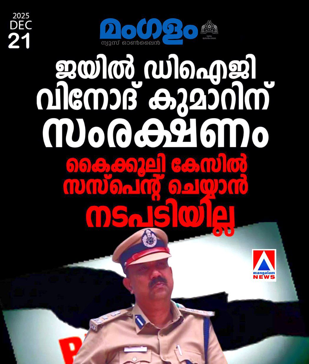 ജയിൽ ഡിഐജി വിനോദ് കുമാറിന് സംരക്ഷണം; കൈക്കൂലി കേസിൽ സസ്പെൻഡ് ചെയ്യാൻ നടപടി വൈകുന്നു