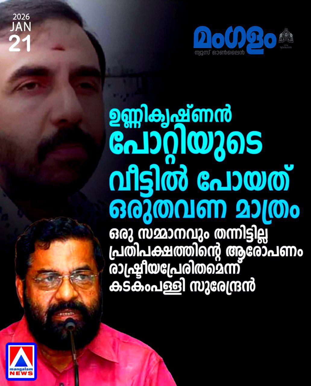 2017-18 കാലഘട്ടത്തിൽ ഒരു ചടങ്ങിന് ക്ഷണിച്ചതനുസരിച്ചാണ് പോറ്റിയുടെ വീട്ടിൽ പോയത്. ഉണ്ണികൃഷ്ണൻ പോറ്റിയുമായി തനിക്ക് സാമ്പത്തിക ഇടപാടുകളില്ലെന്നും അദ്ദേഹത്തിൽ നിന്ന് ഒരു സമ്മാനവും വാങ്ങിയിട്ടില്ലെന്നും കടകംപള്ളി വിശദീകരിച്ചു. പോറ്റിയുമായുള്ള പരിചയത്തെക്കുറിച്ച് അന്വേഷണ സംഘത്തോട് നേരത്തെ തന്നെ വെളിപ്പെടുത്തിയിട്ടുള്ളതാണെന്നും അദ്ദേഹം കൂട്ടിച്ചേർത്തു.