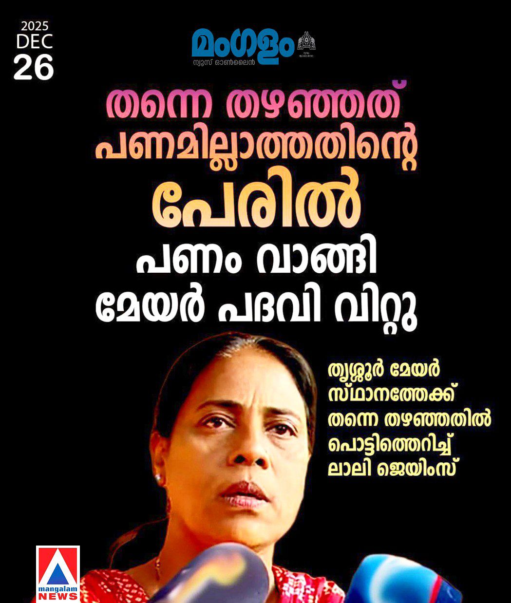 ‘തന്നെ തഴഞ്ഞത് പണമില്ലാത്തതിന്റെ പേരിൽ, പണം വാങ്ങി മേയർ പദവി വിറ്റു’; തൃശൂർ മേയർ സ്ഥാനത്തേക്ക് തന്നെ തഴഞ്ഞതിൽ പൊട്ടിത്തെറിച്ച് ലാലി ജെയിംസ്