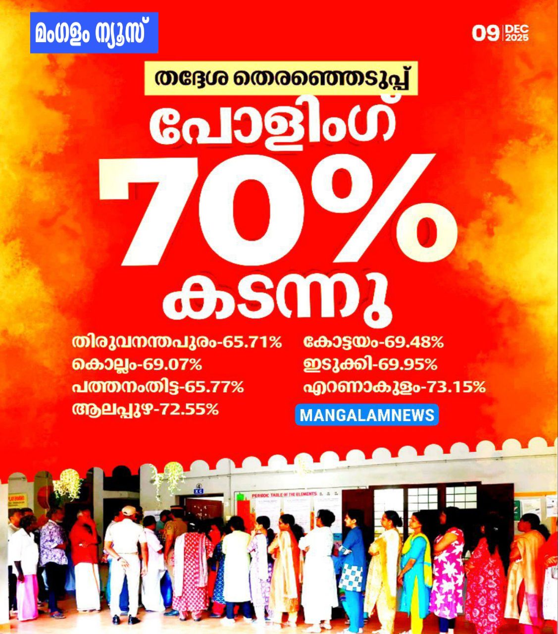 സംസ്ഥാനത്ത് തദ്ദേശ സ്വയംഭരണ സ്ഥാപനങ്ങളിലേക്കുള്ള തെരഞ്ഞെടുപ്പിന്റെ ആദ്യഘട്ട വോട്ടെടുപ്പ് അവസാന ഘട്ടത്തിലേക്ക് കടന്നു. തിരുവനന്തപുരം, കൊല്ലം, പത്തനംതിട്ട, ആലപ്പുഴ, കോട്ടയം, ഇടുക്കി, എറണാകുളം എന്നീ ഏഴ് ജില്ലകളിൽ നടന്ന വോട്ടെടുപ്പിൽ പോളിങ് ശതമാനം എഴുപത് ശതമാനം കടന്നു. മികച്ച പോളിംഗാണ് ആദ്യഘട്ടത്തിൽ രേഖപ്പെടുത്തിയത്. മിക്ക പോളിങ് ബൂത്തുകളിലും വൈകിയും വോട്ടർമാരുടെ നീണ്ട നിര ദൃശ്യമാണ്.