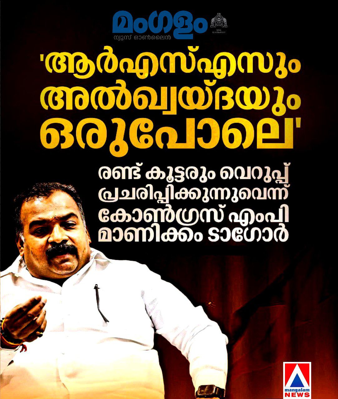 “ആർഎസ്എസ് വെറുപ്പിന്റെ അടിസ്ഥാനത്തിൽ കെട്ടിപ്പടുത്ത സംഘടനയാണ്. ആർഎസ്എസ് വെറുപ്പ് പ്രചരിപ്പിക്കുകയാണ്. വെറുപ്പിൽ നിന്ന് ഒന്നും പഠിക്കാനില്ല. അതേ പോലെയാണ് അൽഖ്വയ്ദയും. ആ സംഘടനയിൽ നിന്ന് എന്തെങ്കിലും പഠിക്കാൻ സാധിക്കുമോ? അൽഖ്വയ്ദയും വെറുപ്പിന്റെ സംഘടനയാണ്. ആ സംഘടനയിൽ നിന്നും പഠിക്കാൻ ഒന്നുമില്ല,” മാണിക്കം ടാഗോർ കൂട്ടിച്ചേർത്തു.