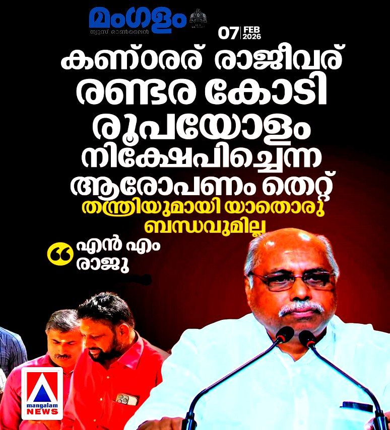 ശബരിമല മുൻ തന്ത്രി കണ്ഠരര് രാജീവര് തന്റെ സ്ഥാപനത്തിൽ രണ്ടര കോടി രൂപ നിക്ഷേപിച്ചെന്ന ആരോപണം എൻ.എം. രാജു തള്ളി. തന്ത്രിയെ താൻ ഇന്നുവരെ കണ്ടിട്ടില്ലെന്നും അദ്ദേഹവുമായി യാതൊരു ബന്ധവുമില്ലെന്നും രാജു പറഞ്ഞു. ഇ.ഡിയും എസ്.ഐ.ടിയും അന്വേഷിച്ചപ്പോൾ കൃത്യമായ വിവരങ്ങളും രേഖകളും നൽകിയിട്ടുള്ളതാണെന്നും അദ്ദേഹം വ്യക്തമാക്കി.