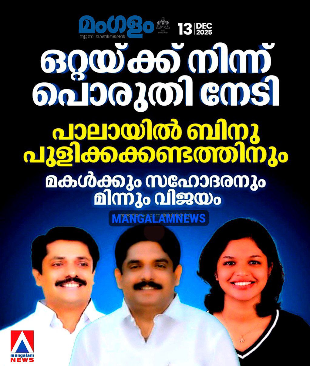 കഴിഞ്ഞ ഭരണസമിതിയിലെ ഇടത് അംഗവും സിപിഐഎം നേതാവുമായിരുന്ന ബിനു പുളിക്കക്കണ്ടം, ബിനുവിന്റെ സഹോദരൻ ബിജു, ബിനുവിന്റെ മകൾ ദിയ എന്നിവരാണ് വിജയിച്ചത്. പാലാ നഗരസഭയിലെ 13, 14, 15 വാർഡുകളിൽ നിന്നാണ് മൂവരും മത്സരിച്ച് വിജയിച്ചത്.