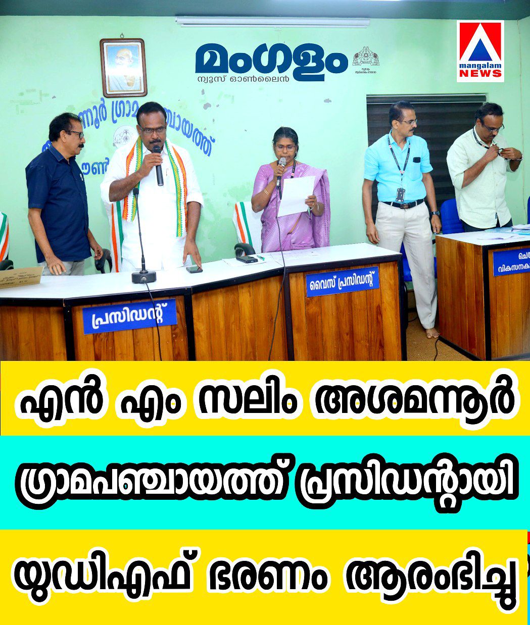 അശമന്നൂർ ഗ്രാമപഞ്ചായത്ത് പ്രസിഡന്റായി എൻ എം സലിം ചുമതലയേറ്റു. റിട്ടേണിങ് ഓഫീസർ കാക്കനാട് ലാൻഡ് സർവ്വേ അസിസ്റ്റന്റ് ഡയറക്ടർ ജാൻസി ജോസഫ് സത്യവാചകം ചെല്ലിക്കൊടുത്തു. ഗ്രാമപഞ്ചായത്ത് സെക്രട്ടറി പി എ അബ്ദുൽ ലത്തീഫ് എൻ എം സലിമിനെ ഷാൾ അണിയിച്ച് സ്വീകരിച്ചു.