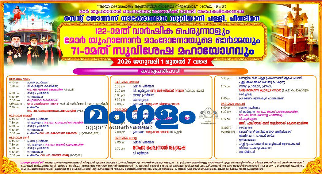 Content Highlight: The 122nd annual feast of St. John’s Jacobite Syrian Church in Pindimana will begin on January 1, 2026, with the flag hoisting ceremony. The week-long celebration includes the 71st Gospel Convention and will conclude on January 7 with a Holy Mass led by Elias Mor Yulios Metropolitan, followed by a grand procession and community feast.