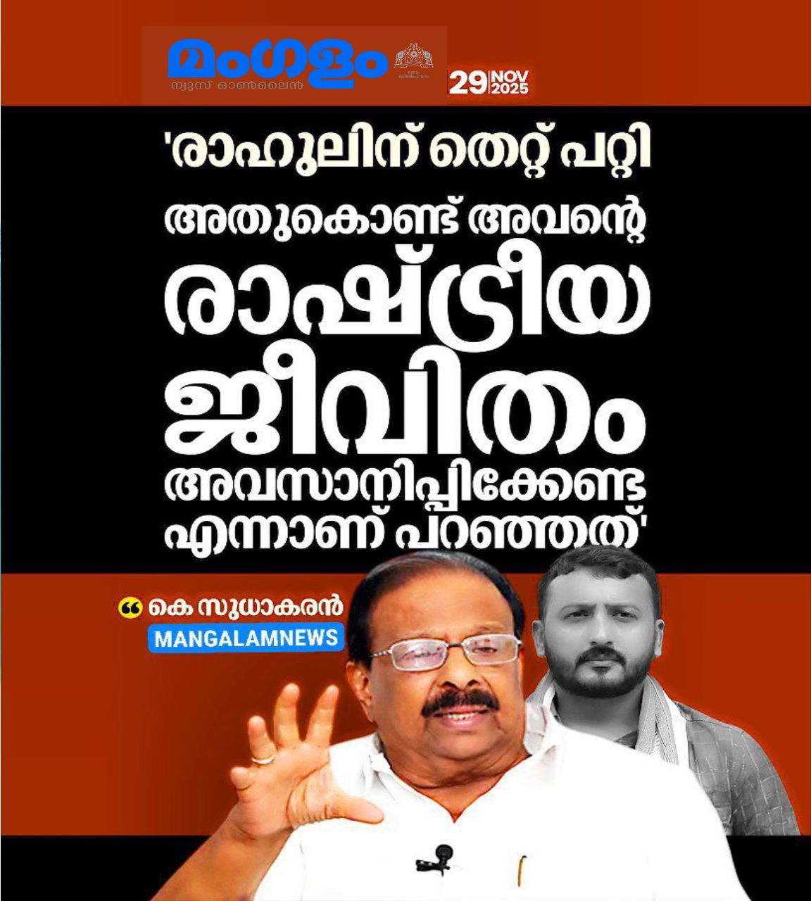 “രാഹുൽ ചെയ്തത് തെറ്റാണ്, മഹാ തെറ്റാണ്. അതിൽ തർക്കമൊന്നുമില്ല. ഫോൺ വിളിച്ച് ഞാൻ പറയേണ്ടതുപോലെ പറഞ്ഞിട്ടുമുണ്ട്. അത് രാഹുലിനോടുള്ള വ്യക്തിപരമായ താൽപര്യമല്ല” എന്നും അദ്ദേഹം കൂട്ടിച്ചേർത്തു.