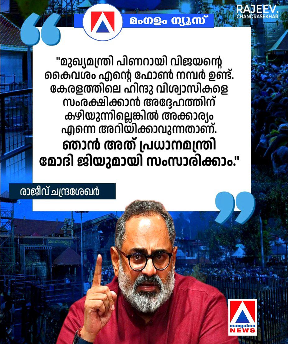 ‘മുഖ്യമന്ത്രിയുടെ കയ്യിൽ എന്റെ നമ്പർ ഉണ്ട്, കേരളത്തിലെ ഹിന്ദു വിശ്വാസികളെ സംരക്ഷിക്കാൻ കഴിയില്ലെങ്കിൽ എന്നെ അറിയിക്കുക, ഞാൻ പ്രധാനമന്ത്രിയുമായി സംസാരിക്കാം’: രാജീവ് ചന്ദ്രശേഖർ