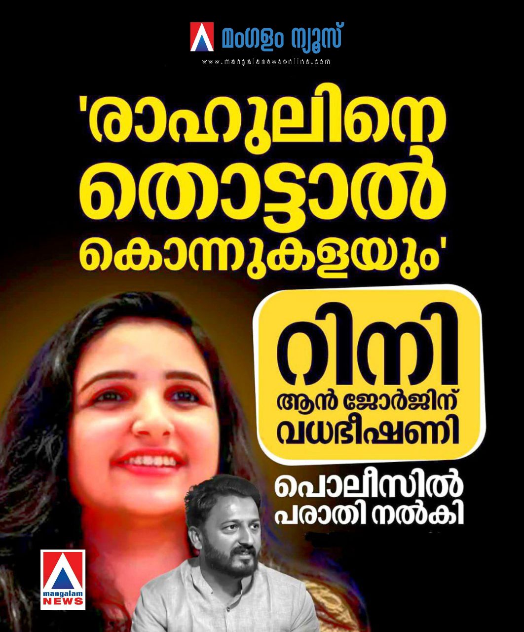 യുവനടി റിനി ആൻ ജോർജിന് വധഭീഷണി. ബലാൽസംഗക്കേസ് പ്രതിയായ രാഹുൽ മാങ്കൂട്ടത്തിൽ എംഎൽഎയെ തൊട്ടാൽ കൊന്നുകളയുമെന്ന് വീടിന്റെ മുന്നിലെത്തി രണ്ടുപേർ ഭീഷണിപ്പെടുത്തിയെന്നാണ് പരാതി. വീടിന്റെ ഗേറ്റ് തകർക്കാൻ ശ്രമമുണ്ടായെന്നും റിനി ആരോപിച്ചു. സംഭവത്തിൽ പൊലീസിൽ പരാതി നൽകി.