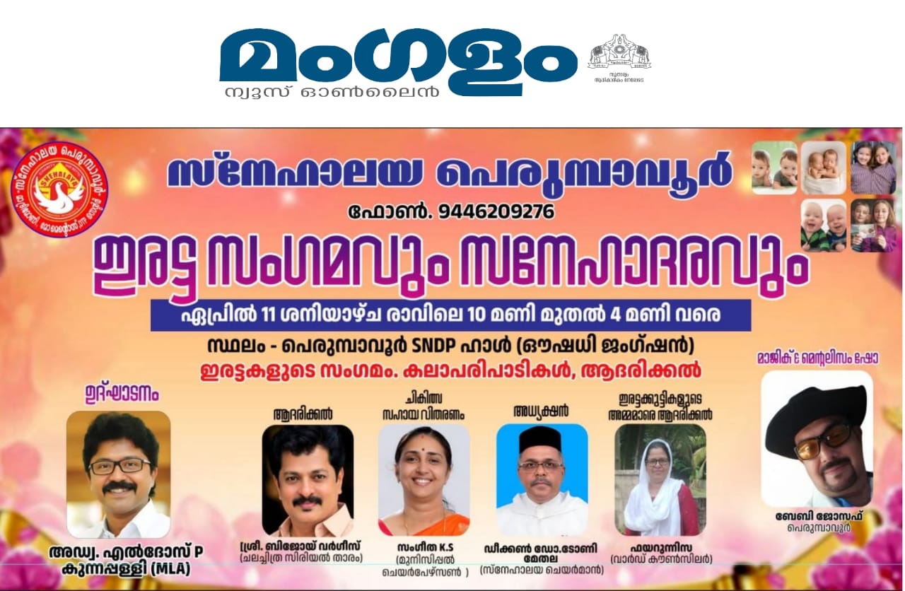 - Snehalaya Perumbavoor organizes ‘Iratta Sangamam’ (Twins Meet) on April 11 at SNDP Hall.