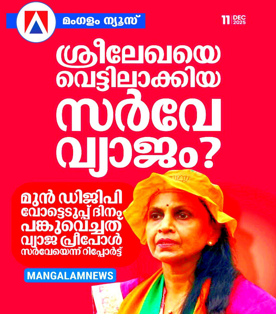ബിജെപി സ്ഥാനാർത്ഥി മുൻ ഡിജിപി ആർ ശ്രീലേഖ വോട്ടെടുപ്പ് ദിവസം സമൂഹമാധ്യമങ്ങളിൽ പങ്കുവെച്ച പ്രീപോൾ സർവേ വ്യാജമാണെന്ന് റിപ്പോർട്ടുകൾ പുറത്തുവന്നു. തിരുവനന്തപുരം കോർപ്പറേഷൻ ശാസ്തമംഗലം വാർഡിൽ മത്സരിക്കുന്ന ശ്രീലേഖ തെരഞ്ഞെടുപ്പ് ദിവസം തന്നെ എൻഡിഎയ്ക്ക് അനുകൂലമായ അഭിപ്രായ സർവേ സോഷ്യൽ മീഡിയയിൽ പ്രചരിപ്പിച്ചിരുന്നു.