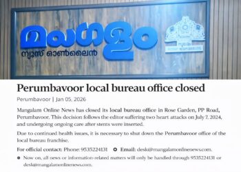 Read moreപെരുമ്പാവൂർ | 05, ജനുവരി | 2026 പെരുമ്പാവൂർ പി.പി റോഡിലെ റോസ് ഗാർഡനിൽ പ്രവർത്തിച്ചിരുന്ന മംഗളം ന്യൂസ് ഓൺലൈൻ പ്രാദേശീക ബ്യൂറോ ഓഫീസ് ഇനി മുതൽ...