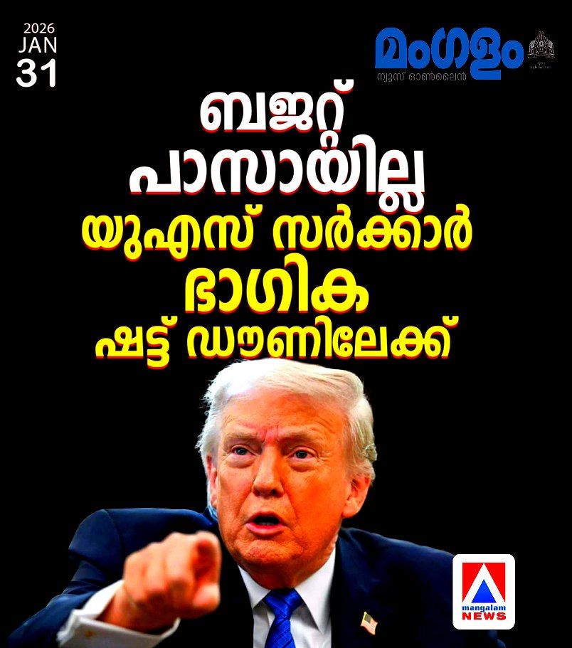 ​വാഷിംഗ്ടൺ: 2026-ലെ ബജറ്റിന് യുഎസ് കോൺഗ്രസ് അംഗീകാരം നൽകാത്തതിനെത്തുടർന്ന് അമേരിക്കൻ സർക്കാർ ഭാഗിക ഷട്ട് ഡൗണിലേക്ക് കടന്നു. ബജറ്റ് പാസാക്കാനുള്ള സമയപരിധി ജനുവരി 30 അർദ്ധരാത്രിയോടെ അവസാനിച്ചതോടെയാണ് രാജ്യം ഭരണസ്തംഭനത്തിലേക്ക് നീങ്ങിയത്. ഇതോടെ ദേശീയ പാർക്കുകൾ, പാസ്‌പോർട്ട് സേവനങ്ങൾ തുടങ്ങി അവശ്യവിഭാഗത്തിൽ ഉൾപ്പെടാത്ത നിരവധി സർക്കാർ ഓഫീസുകളുടെ പ്രവർത്തനം താൽക്കാലികമായി നിലച്ചു.
