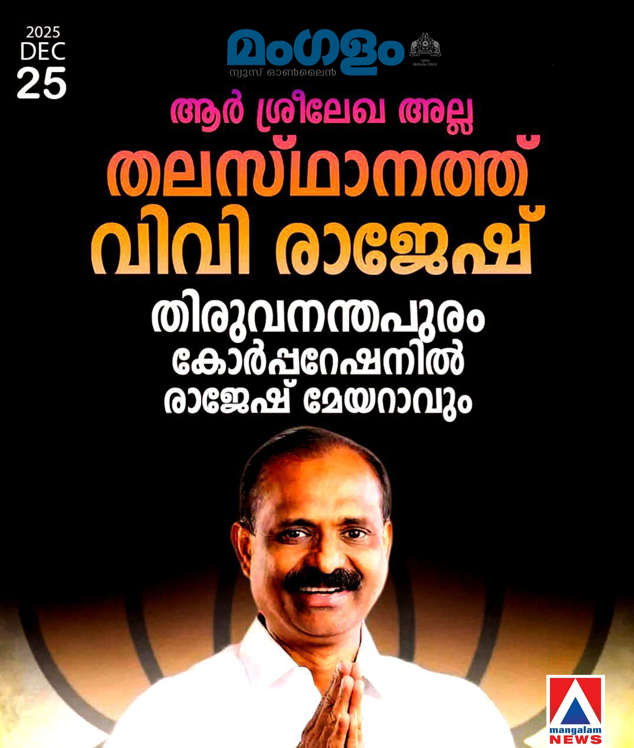 ​ഏറെ നാളത്തെ അനിശ്ചിതത്വങ്ങൾക്കും തർക്കങ്ങൾക്കുമൊടുവിൽ തിരുവനന്തപുരം കോർപ്പറേഷൻ മേയർ സ്ഥാനത്തേക്ക് ബി.ജെ.പി നേതാവ് വി.വി. രാജേഷിനെ നിശ്ചയിച്ചു. മുൻ ഡി.ജി.പി ആർ. ശ്രീലേഖയുടെ പേര് സജീവമായി പരിഗണിക്കപ്പെട്ടിരുന്നെങ്കിലും പാർട്ടിയിലെ ഒരു വിഭാഗം എതിർപ്പുമായി രംഗത്തെത്തിയതോടെയാണ് രാജേഷിന് നറുക്കുവീണത്. ഇതോടെ ശ്രീലേഖ മേയർ സ്ഥാനാർത്ഥിയാകുമെന്ന അഭ്യൂഹങ്ങൾക്ക് അറുതിയായി.